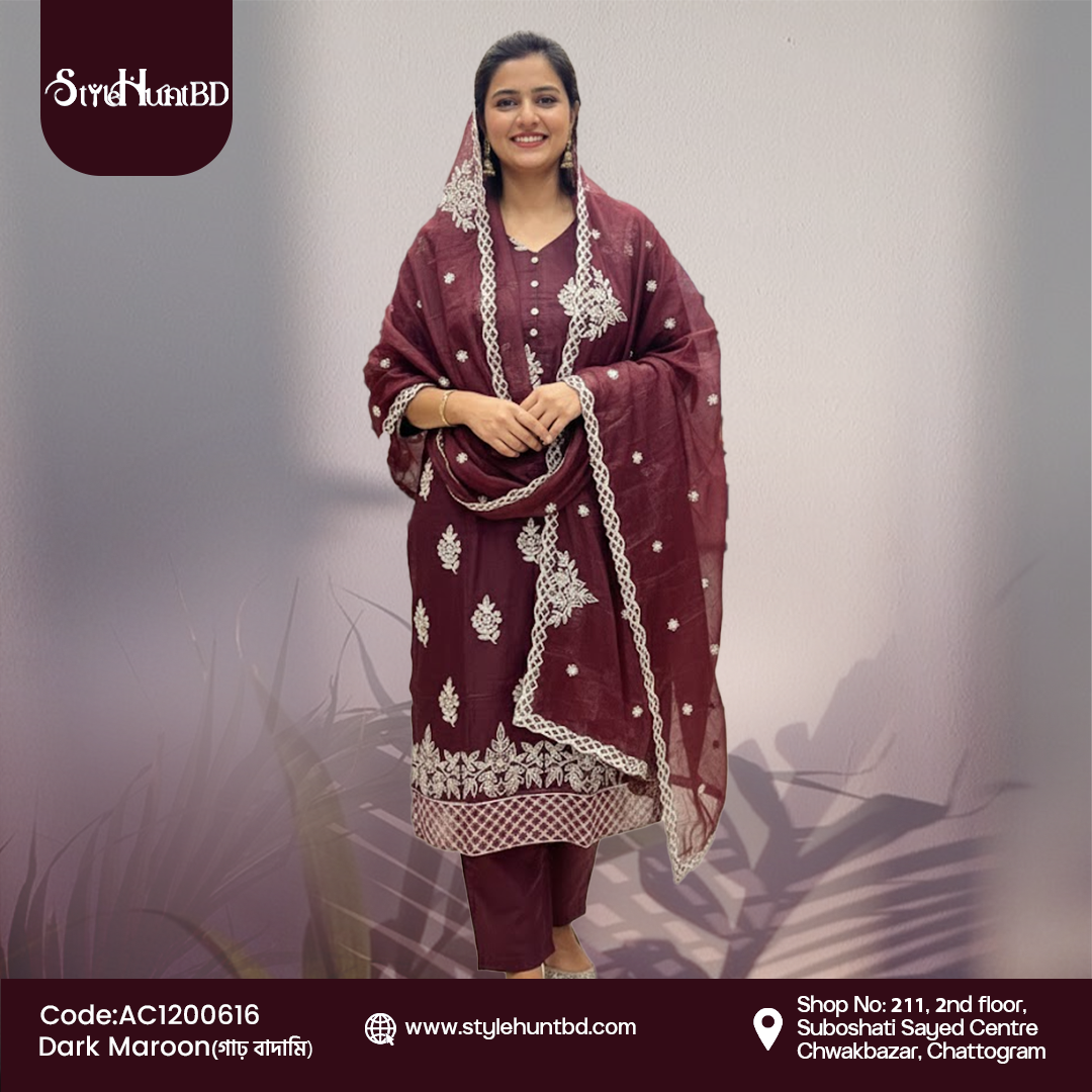 Soft and elegant dark maroon 3 piece dress made from breathable cotton fabric for all-day comfort. The 3 piece dress features a modest and stylish design, perfect for office, festive occasions, and daily wear