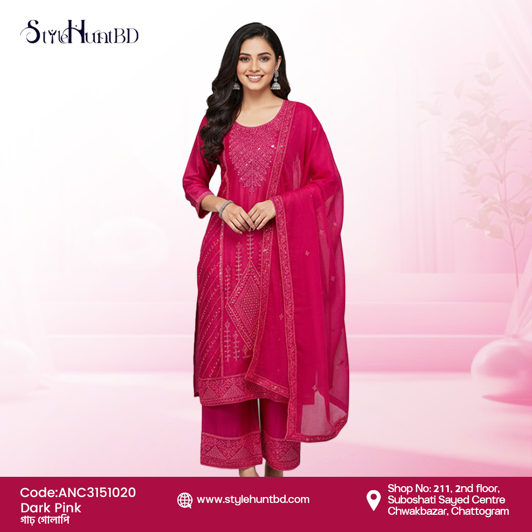 Vibrant dark pink 3 piece dress (Code: ANC3151020) crafted from luxurious Afghani Silk . This lightweight, breathable fabric ensures comfort throughout the day. The lively color combined with a modest design makes it perfect for celebrations, work, and everyday wear.