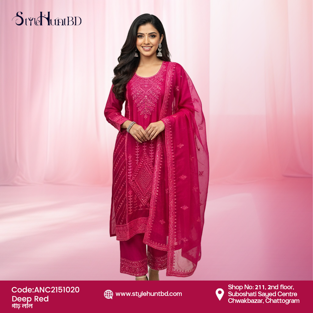 Rich deep red 3 piece dress (Code: ANC215120) made from premium Afghani Silk. The soft and breathable fabric ensures comfort throughout the day. Its elegant and modest design is perfect for festive events, office wear, and everyday occasions.