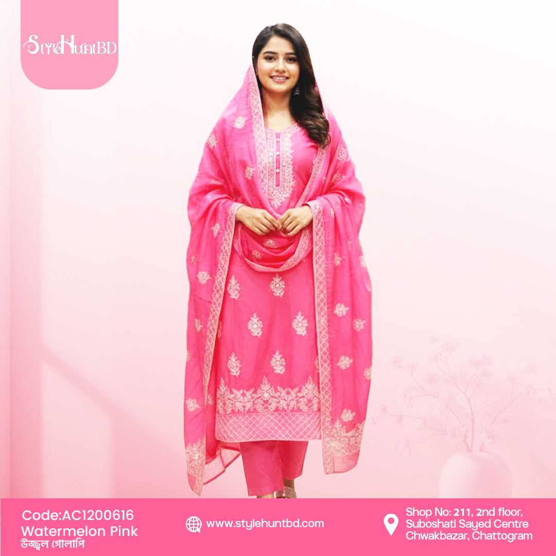 Vibrant and soft 3 piece dress in watermelon pink (Code: AC1200616). Crafted from breathable cotton fabric for all-day comfort. Features a modest and elegant design, ideal for festive events, office wear, and daily use.
